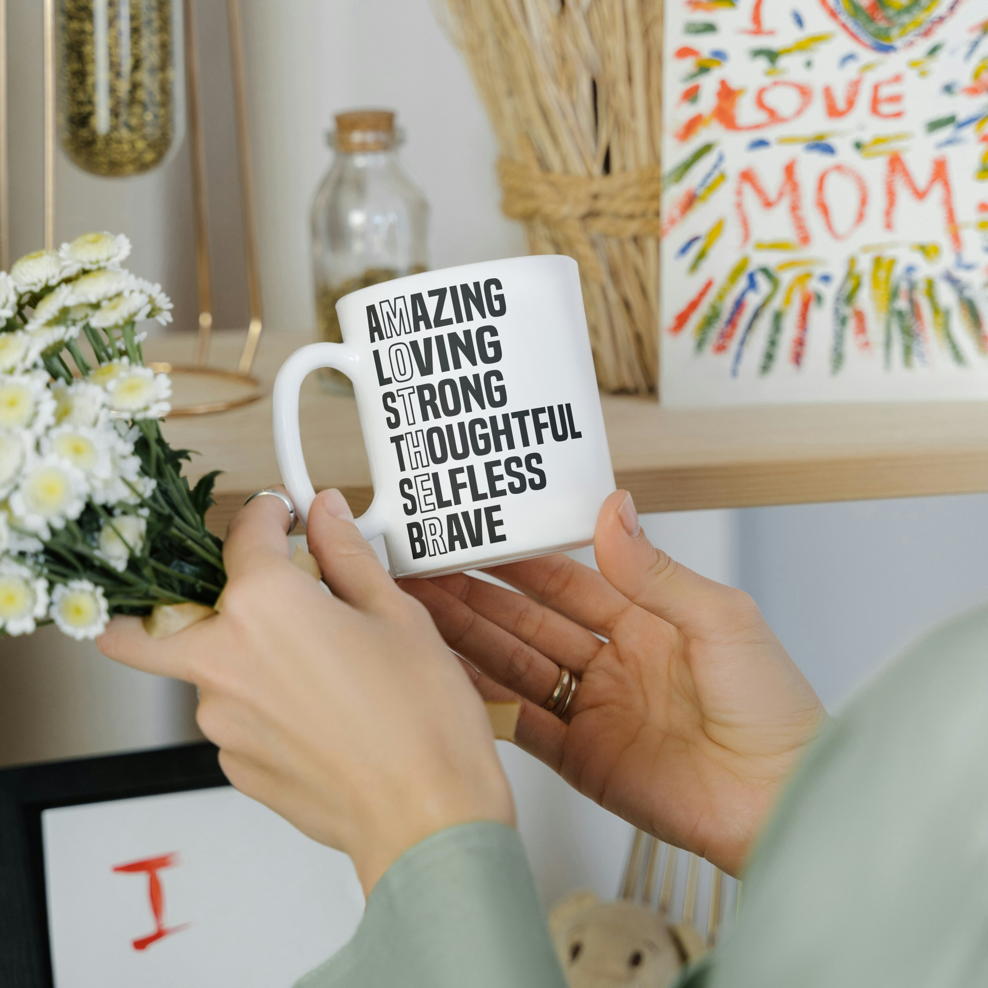 Celebrate the incredible woman who means the world to you with this heartfelt Mother's Definition Mug. Featuring a bold acrostic design that spells out MOTHER — Amazing, Loving, Strong, Thoughtful, Selfless, Brave — this mug is the perfect daily reminder of her strength and love.